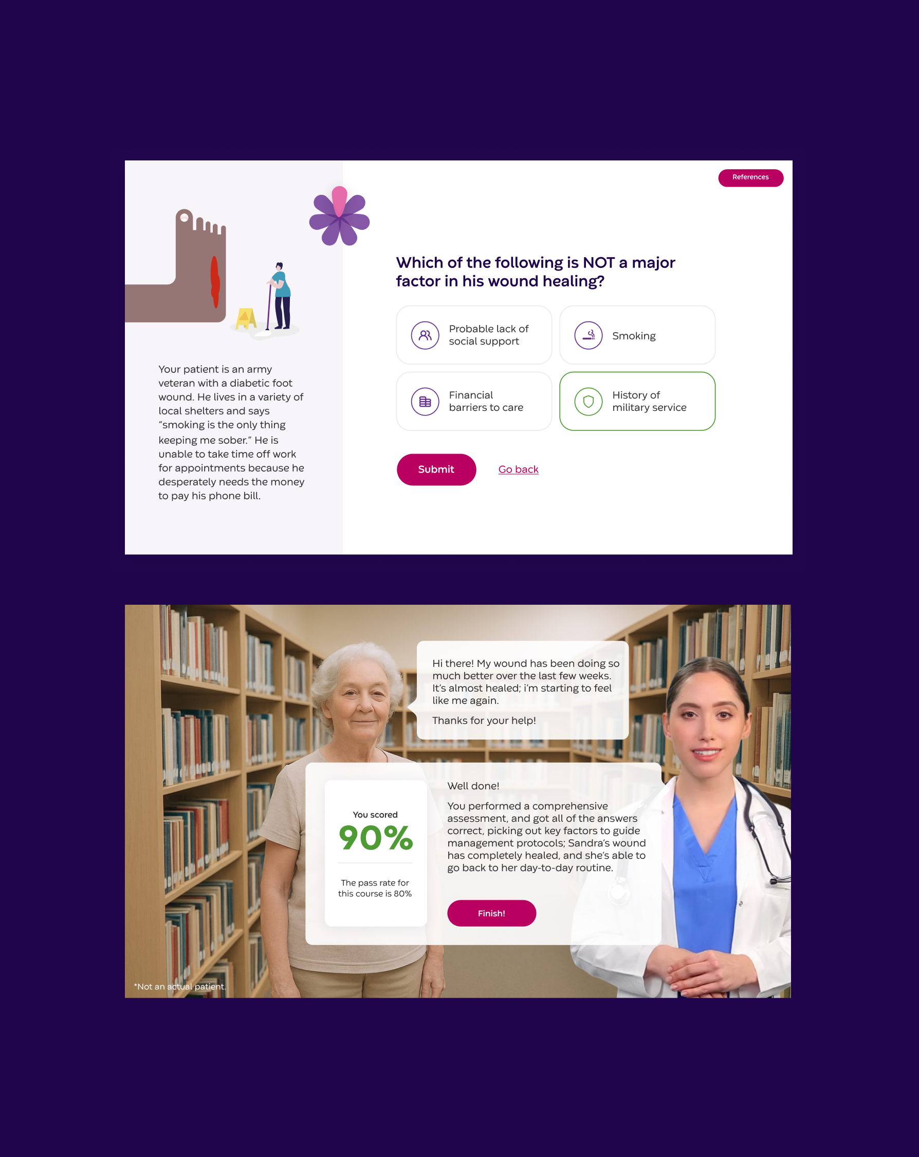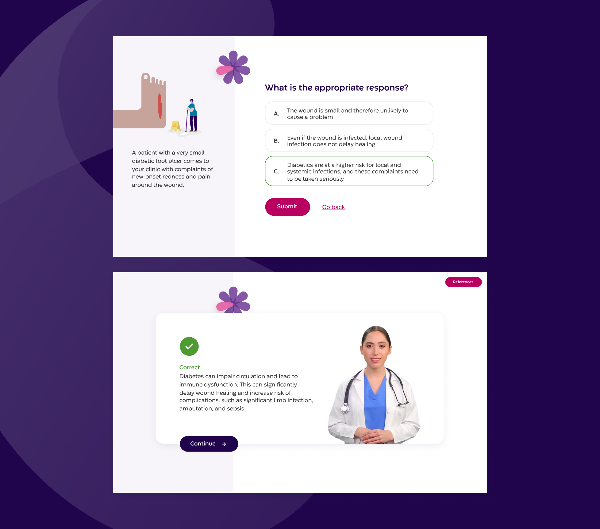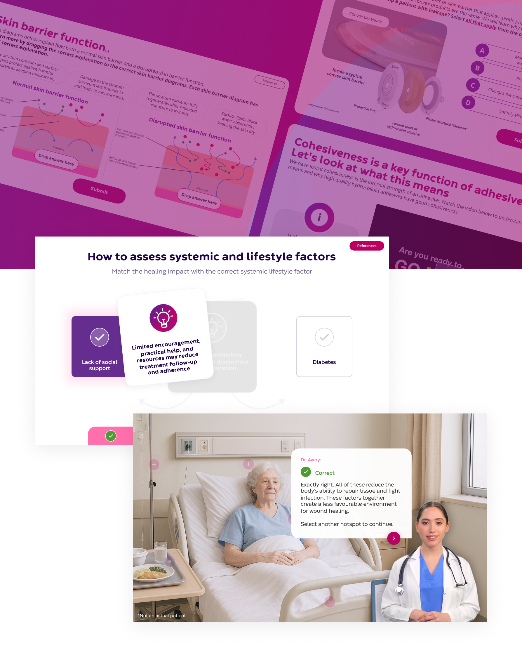 The creation of a suite of branded collateral for the LMS dashboard using existing brand guidelines. Then, working with a Medical Writer to create a series of interactive e-learning courses using Articulare Storyline and subsequent available APIs to enhance the experience.